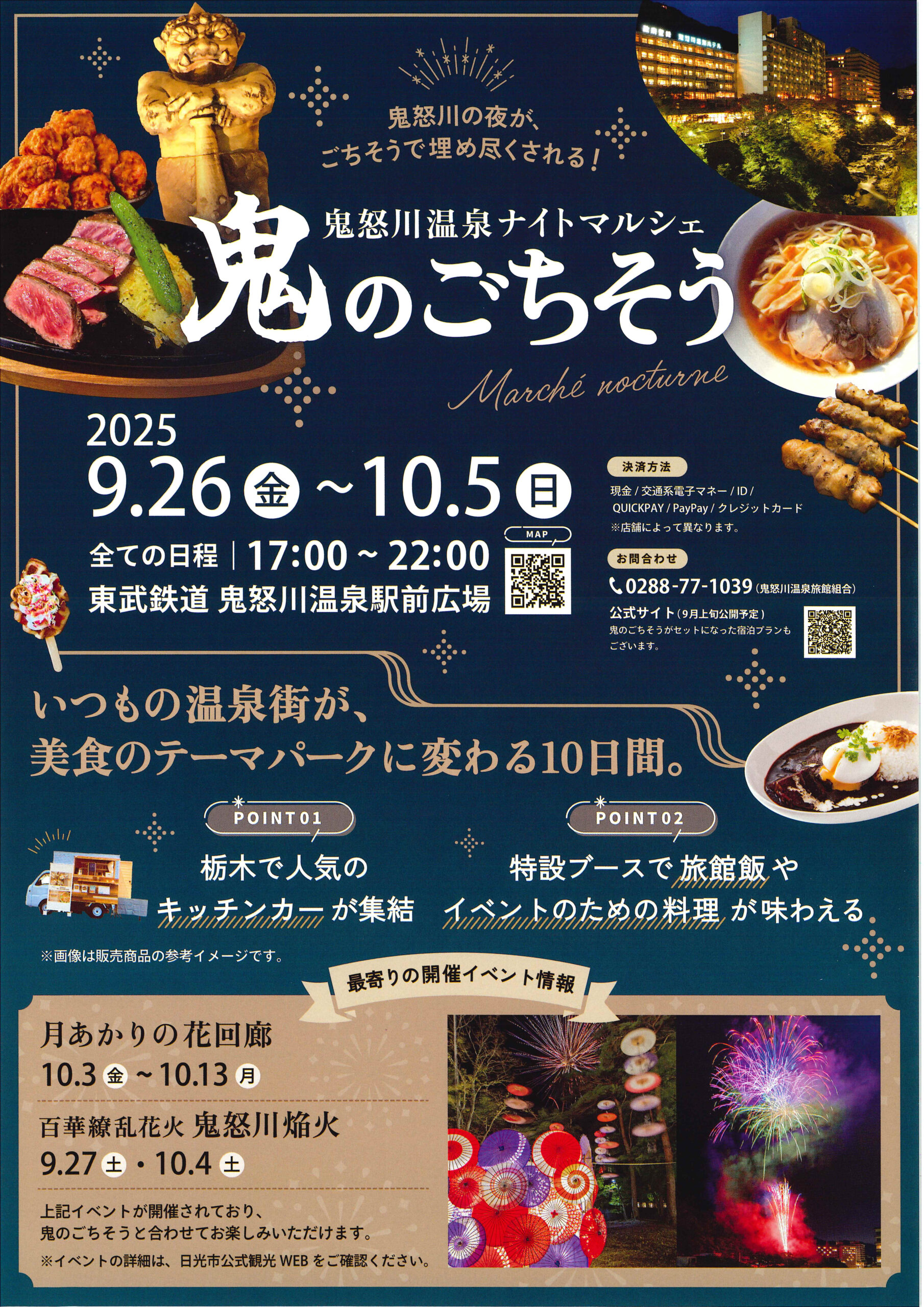 今年の秋、鬼怒川温泉の夜が変わります。駅前広場で開催される「鬼のごちそう」ナイトマルシェは、旅館自慢のお弁当や地元の人気グルメが終結する特別な夜市。キッチンカーや屋台が並び、お酒とともに自由に食べ歩きが楽しめます!
